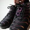 Tu vois cette paire de TN, en France elle est sortie que en modèle femme, donc je l’ai ramené des Etats Unis, car ils l’ont aussi fait en model homme. Mais t’as un petit bonus en plus, normalement t’as qu’un seul mousqueton sur la paire, j’ai réussi à en avoir un deuxième. Disons que je l’ai emprunté sur une autre paire de la boutique. Je ne les porte plus, c’est pas trop mon style finalement, j’ai du les porter 10 fois à tout casser. La paire c’est du 44.5 car ça taille petit les TN, normalement je taille du 43.5 voir 44.
